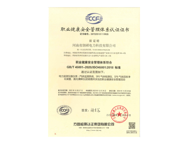 职业健康安全体系认证证书